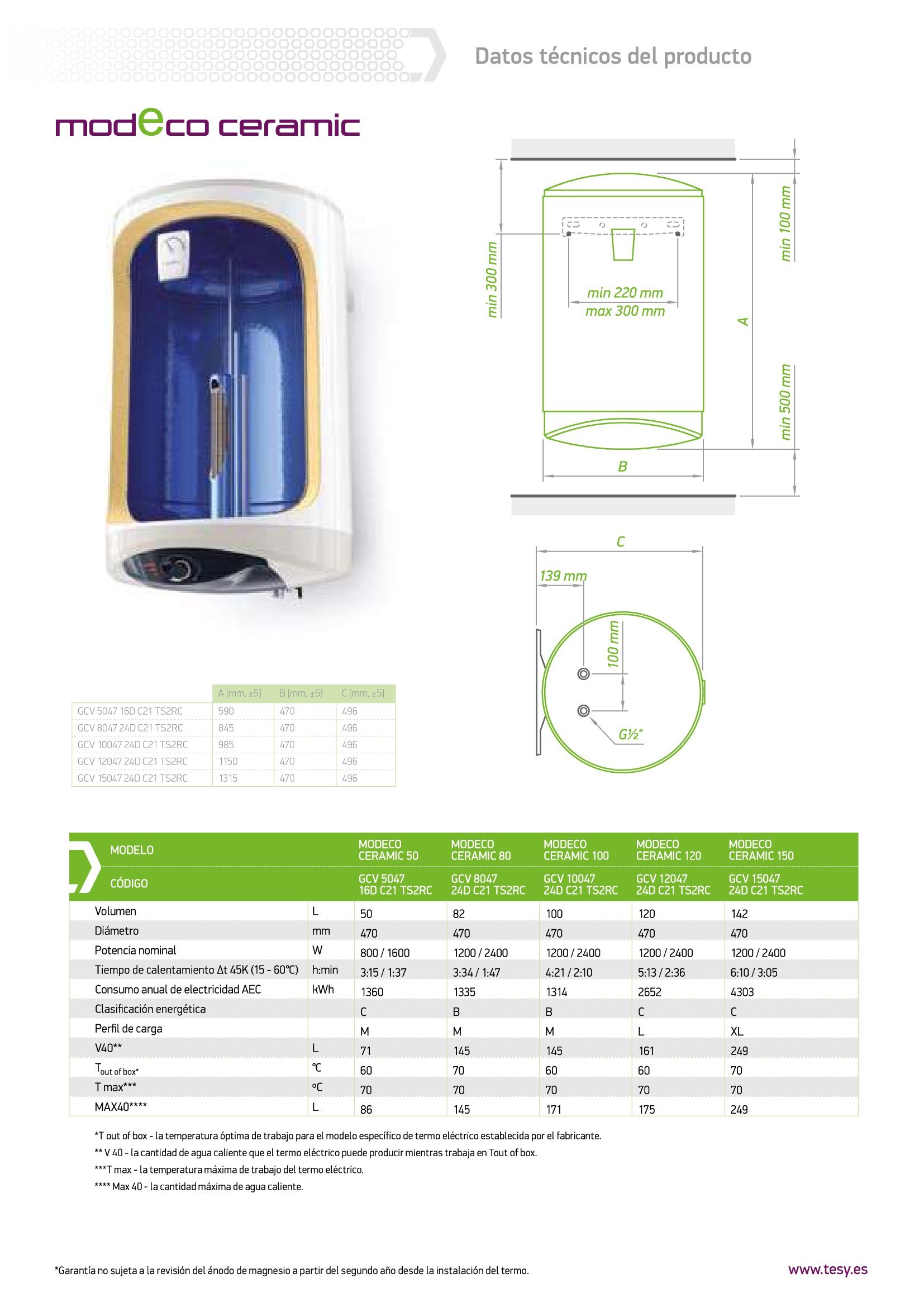 Medidas: Altura m: 0.845 Anchura m: 0.470 Profundidad m: 0.496Los termos eléctricos de la gama Modeco Ceramic son ideales para trabajar en zonas con aguas duras. La resistencia cerámica, protegida por una carcasa metálica con cubierta vitrocerámica, proporciona un funcionamiento silencioso, una vida útil larga y una protección segura contra las incrustaciones de cal. La gama está compuesta por modelos con capacidad desde 50 hasta 150 litros.