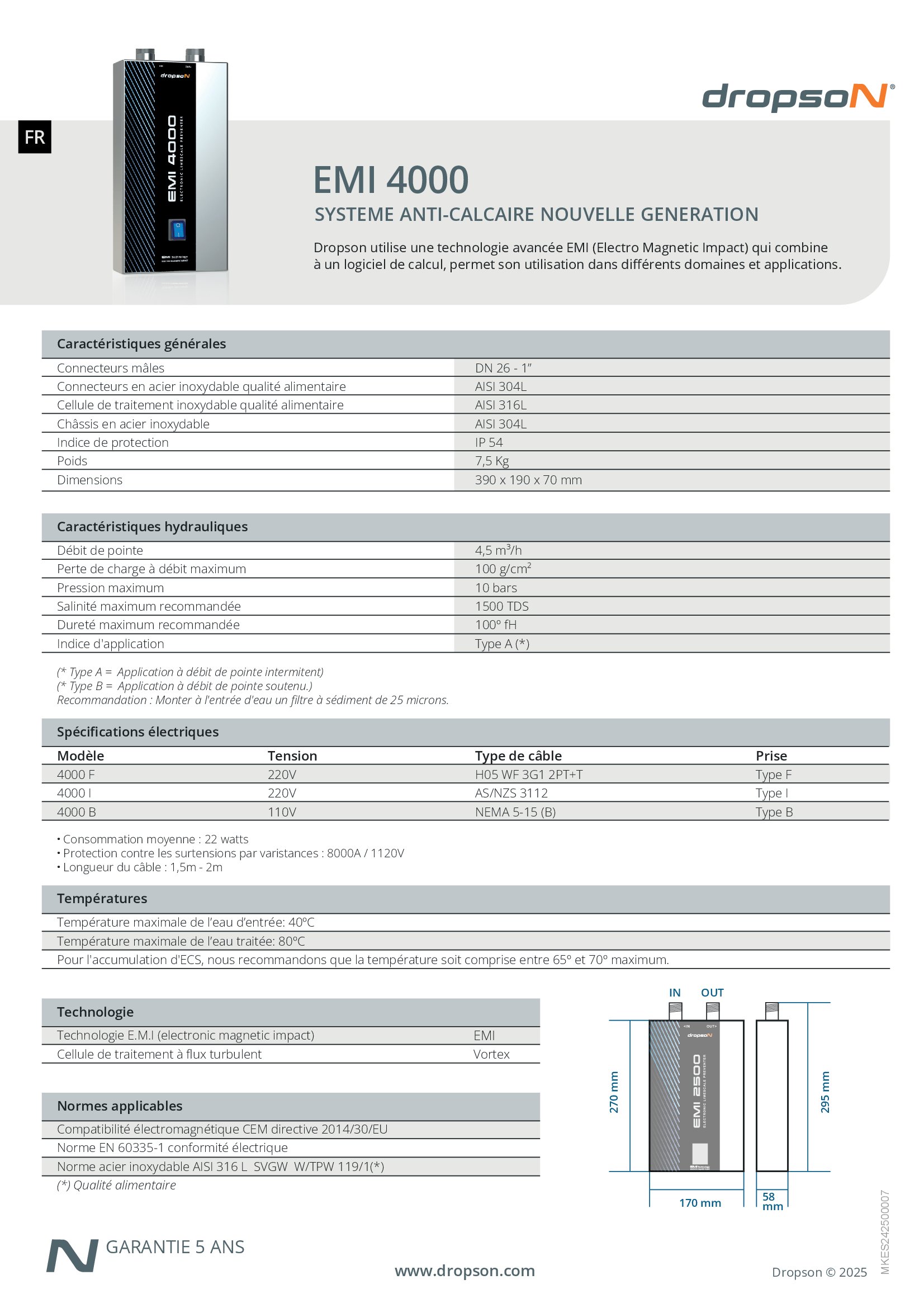 Descalcificador electrónico domestico con caudales de hasta 4,5 metros cúbicos por hora. Sistema antical electrónico Dropson EMI para instalaciones de agua caliente sanitaria (ACS) y agua fría. Especialmente indicados para instalaciones residenciales, profesionales, piscinas y fuentes. Dropson recomienda la instalación de un filtro de sedimentos previo al sistema antical. Dimensiones de 390 x 190 x 70 mm.