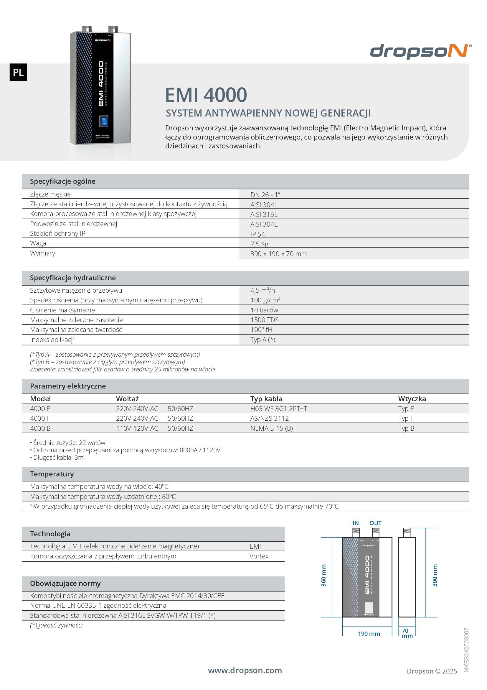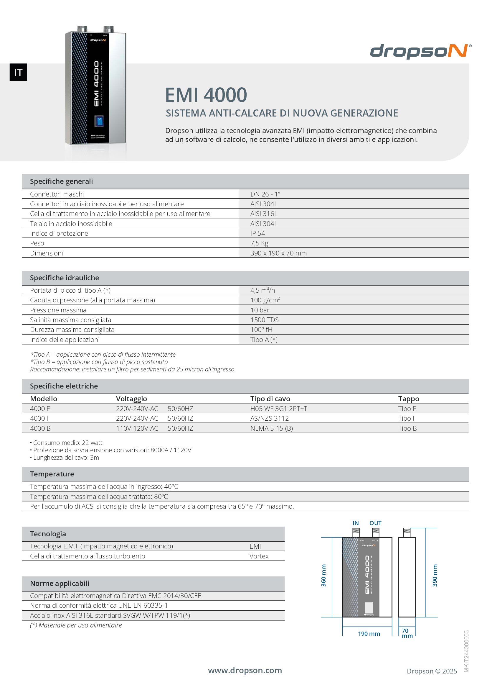 Medidas: Dimensiones de 390 x 190 x 70 mm.Descalcificador magnético Dropson EMI 4000 de 4.5 m3/h, con cubierta y chasis fabricados en acero inoxidable satinado. Es un sistema antical de nueva generación que está destinado para aplicaciones domésticas, profesionales, fuentes y piscinas. Dimensiones de 390 x 190 x 70 mm. Conector de rosca exterior 1″.